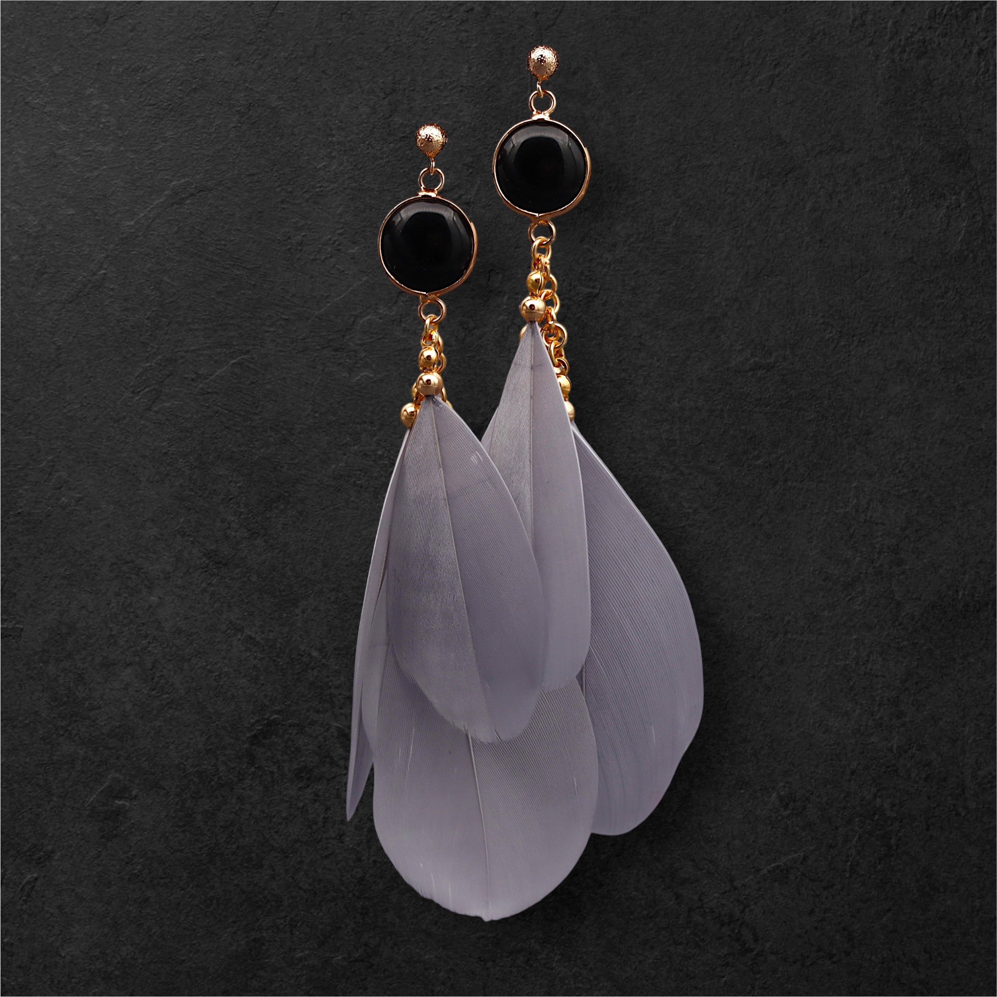 The gemstone is agate (dyed). Feathers. 18k gold-plated jewelry details. The length of the earrings including the hook is 12cm. The weight of one earring is 3.8 grams.