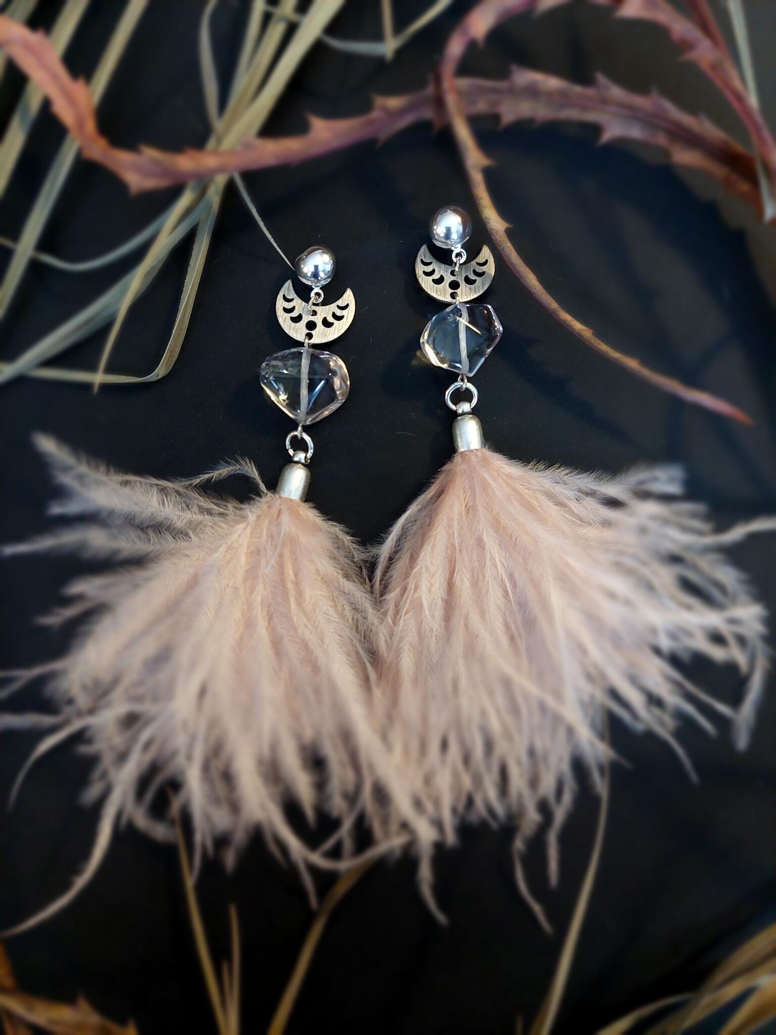 The gemstone is ametrine. Feathers. Silver-tone brass jewelry details.